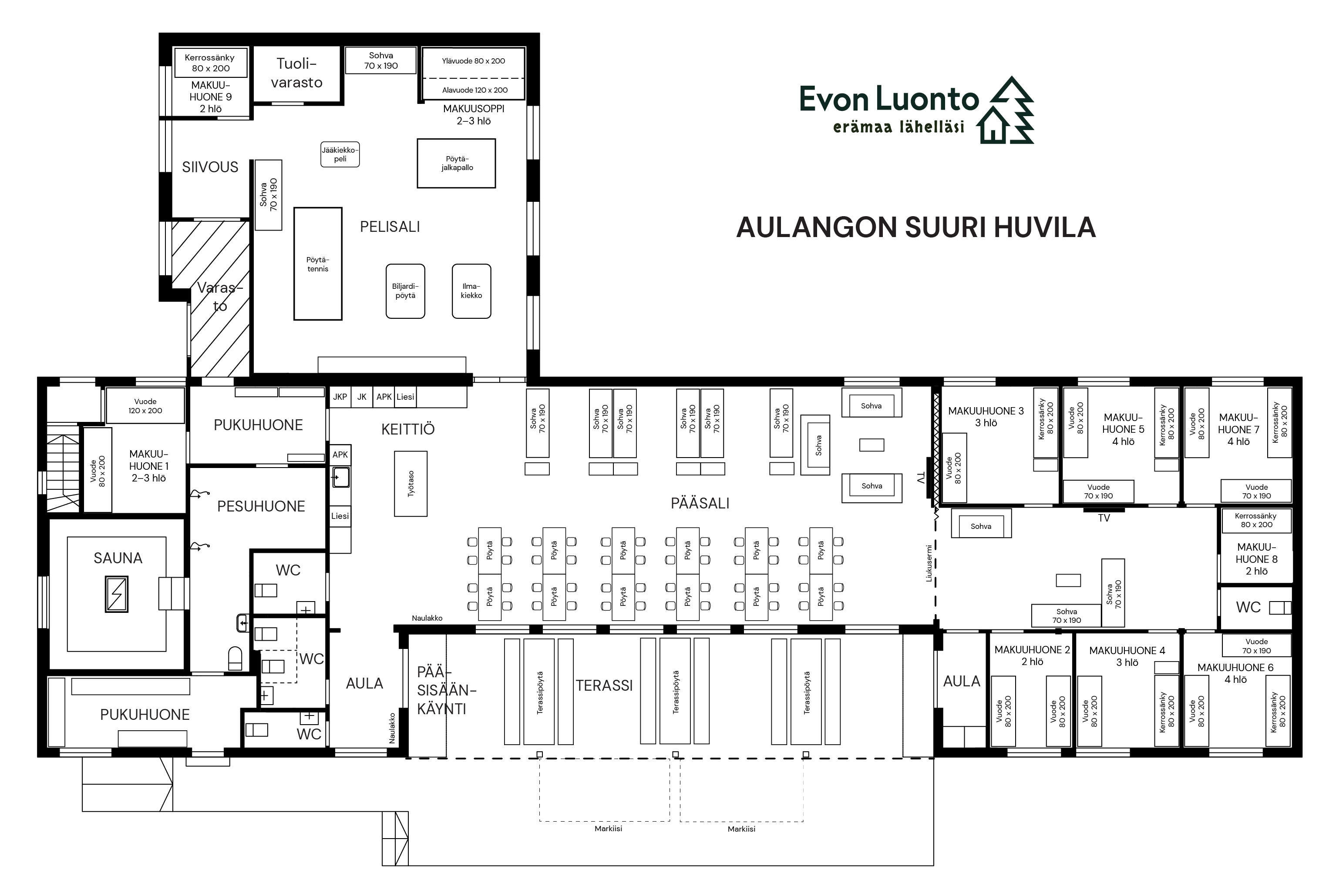 HINNAD: Aulanko Grand Villale broneerimishind sisaldab 350-ruutmeetrist mitmeotstarbelist villa kasutamist. Täiendavaid teenuseid, mida saab tellida, hõlmavad mängutoa, grilliala, kümblustünnide ja rannasauna kasutamist, lõpppuhastust, voodipesu eelnevalt valmistatud või eraldi saadud rätikute ja rätikute jaoks. Pakume ka paadi- ja kanuurenti, programmiteenuseid, toitlustusteenuseid ja tööteenuseid, nagu saunade ja kümblustünnide ettevalmistamine enne külaliste saabumist. Kõiki täiendavaid teenuseid tuleks tellida vähemalt 14 päeva enne saabumist.