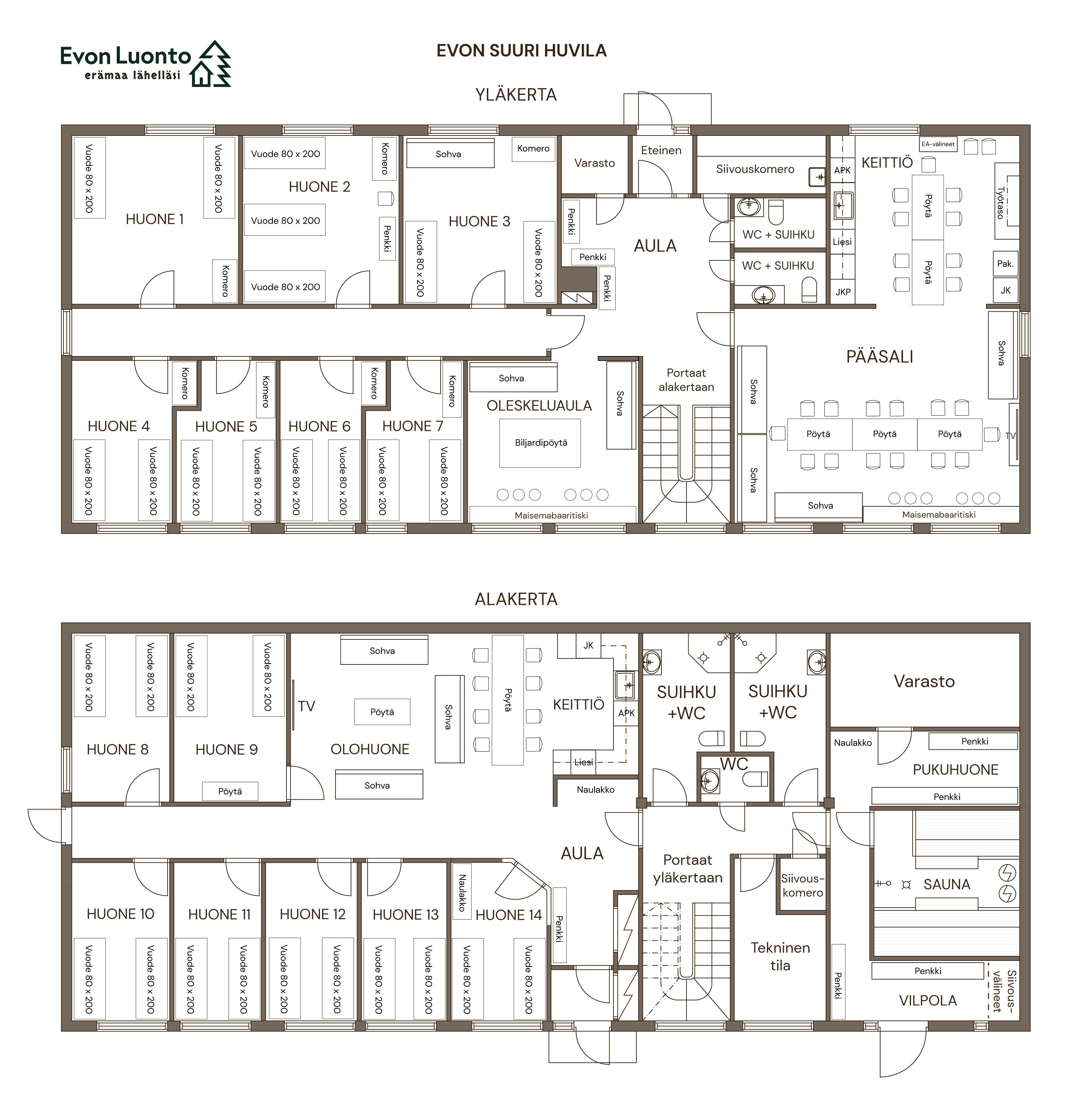 MAJUTUS: Villa mahutab umbes 45 külalist 14 magamistoas koos 35 voodikohaga, lisaks on voodikohti ja madratsid põrandale vähemalt 10 inimesele. Kui saabumiskuupäev on vähem kui 6 nädala kaugusel, saab alumist korrust üürida eraldi kui Evo Lake Apartement, mahutades umbes 5–20 külalist.