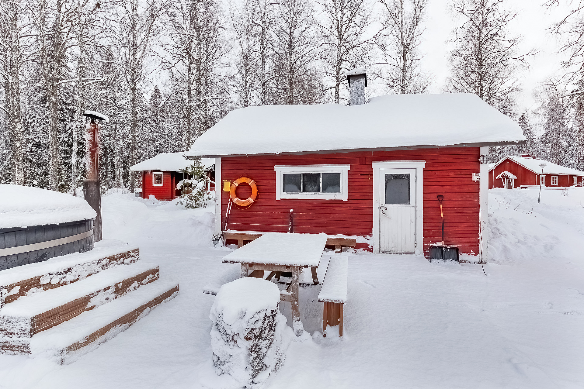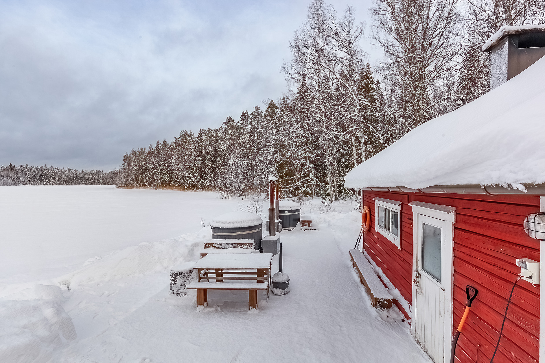VÄLIRUUMID JA MULLIVANNID: Kaks puiduküttega mullivanni 6 inimesele järve äärsel terrassil. Aastaringselt kasutatav grillimisvarjualune, lõkkeplats, avatud terrass pingidega ja täiendav terrass lõkkeplatsi lähedal.