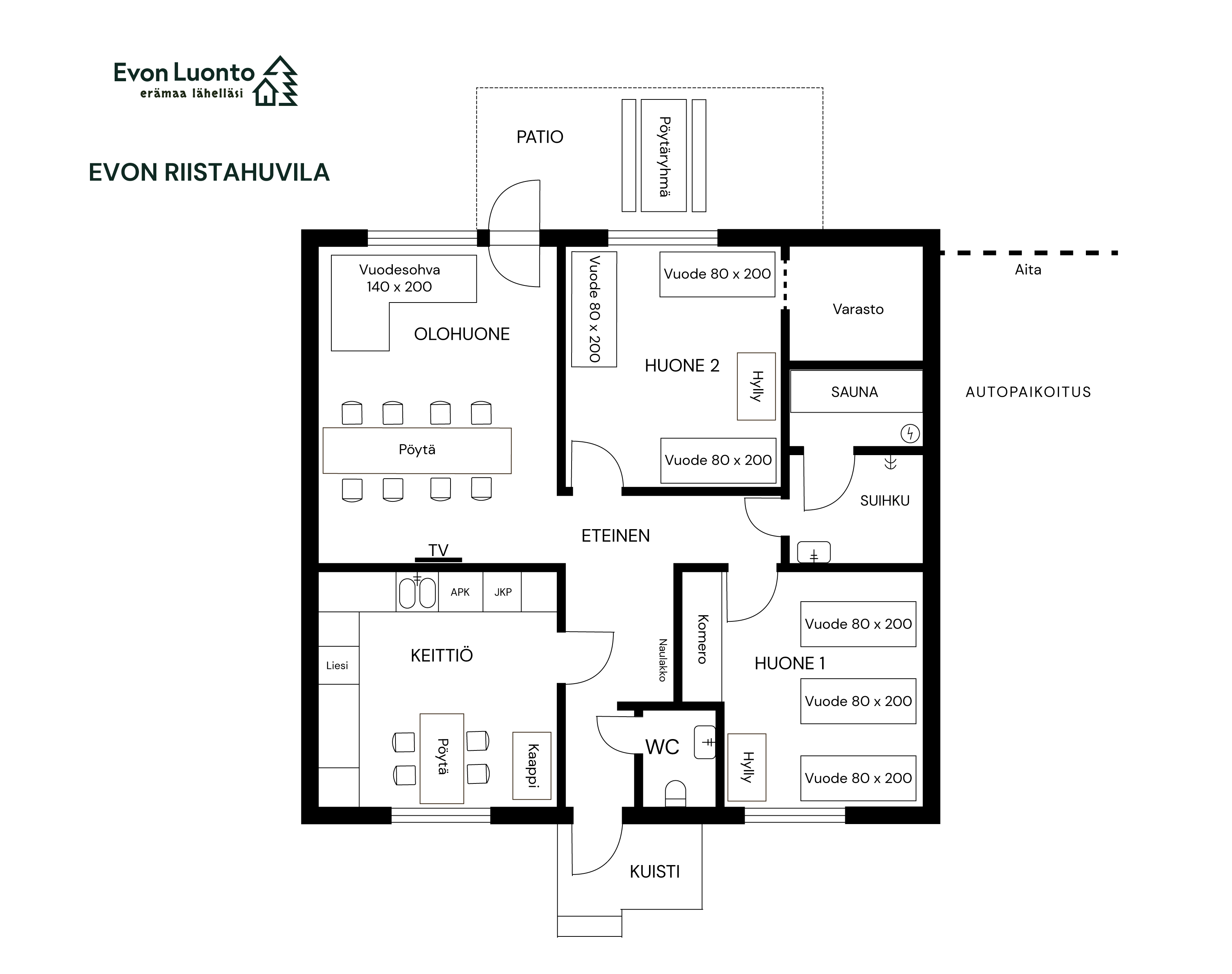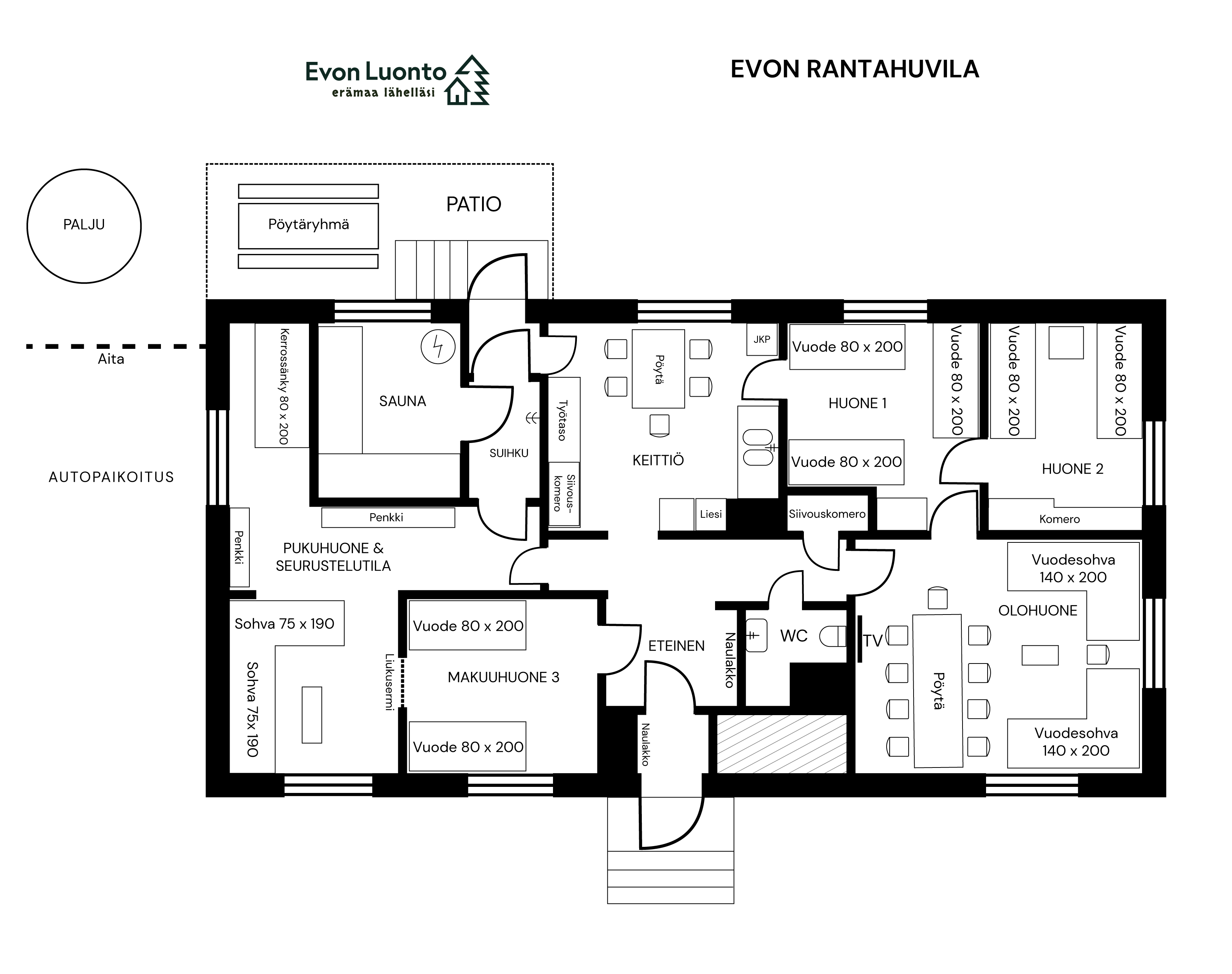 MAJUTUS: Kokku pakub Evo Twin 5 magamistuba ja 20–24 voodikohta. Umbes 90-ruutmeetrine Evo Hunt House mahutab 7–8 inimest oma 2 magamistoaga ja lisamagamisvõimalustega elutoas. Umbes 130-ruutmeetrine Evo Lakeside Villa mahutab 13–16 inimest oma 3 magamistoaga ning elutoas ja riietusruumis olevate diivanitega.