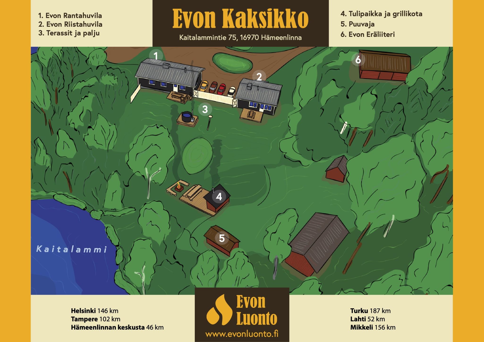 ÜLDINFO: Evo Twin, asukohaga Evo Peace piirkonnas Hämeenlinnas, koosneb Evo Hunt House’ist ja Evo Lakeside Villast. Terve kompleks sobib ürituste, pidude, töökoha terviseedenduse, konverentside, majutuse ja puhkuse korraldamiseks nii eraklientidele kui ka äriklientidele looduse südames. Lisaks saab elamuse täiendamiseks kasutada lähedalasuvat Evo Wilderness Barn, mis toimib ürituste ja pidude korraldamise kohana soojemal hooajal.