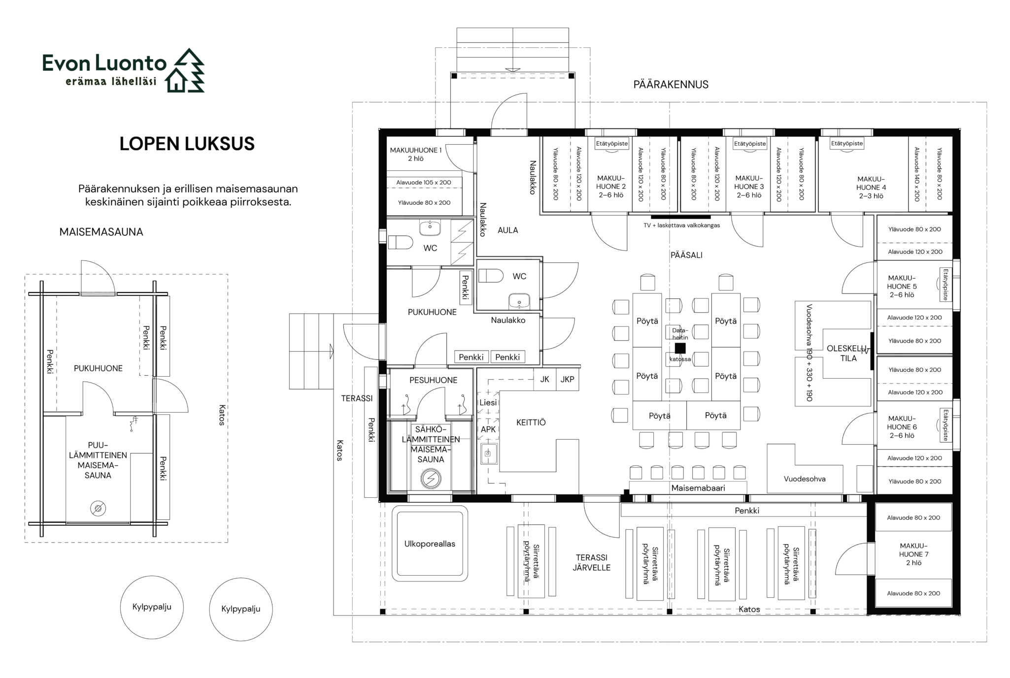 Selle ainulaadse looduse pärli vahetus läheduses leiate kõik hõrgutised, mis rahuldavad ka kõige nõudlikumaid maitseid, alates looduslikust lehtlast ja maastikusaunast kuni kuumade vannide ja mullivannideni. Olenemata sellest, kas otsite ruumi produktiivseks meeskonnaürituseks või lõõgastavaks puhkuse seikluseks, Loppi Luxus on usaldusväärne valik!