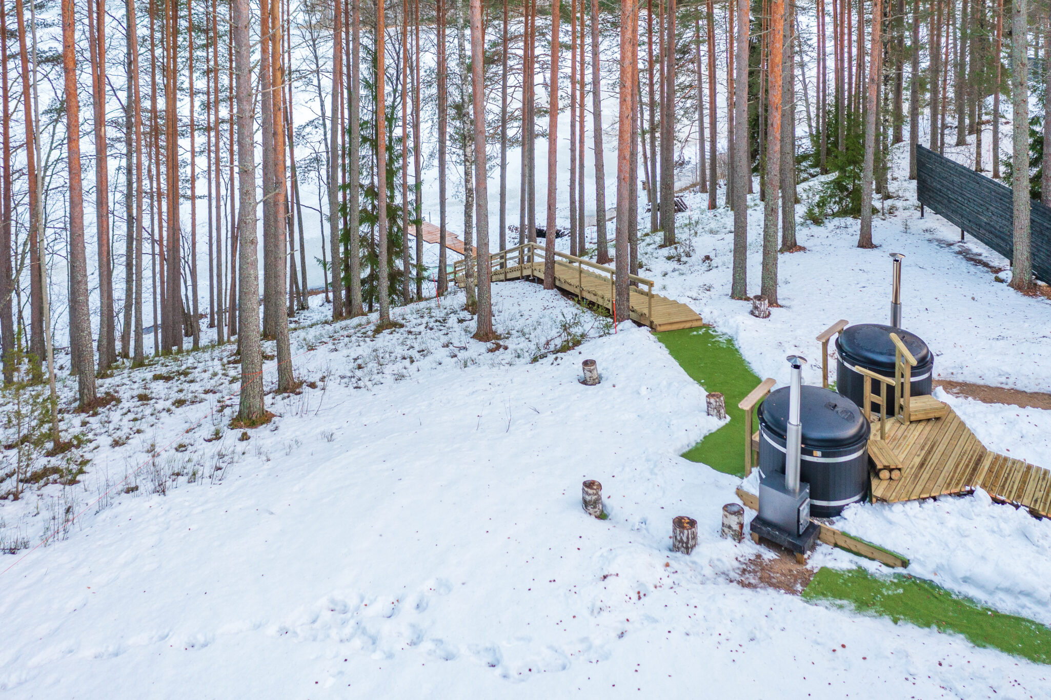 VÄLISALAD JA KÜMBLUSTÜNNID: Saunaalal asuval terrassil on kasutusvalmis väliskümblustünn 5 inimesele ja kaks puuküttega kümblustünni, kumbki 6 inimesele. Kolmas kümblustünn asub järve ääres kai ees. Trepid viivad saunadest järve, kus saab ujuma minna kas kai pealt või otse kaldalt. Kallas on liivase põhjaga ja sobib ka lastele. Villa osaliselt kaetud terrass, mis ulatub üle 50 ruutmeetri, ümbritseb hoonet kahest küljest. Maastikusauna ja villa vahel on maalähedane lehtla, mis toimib ka kaetud lõkkekohana.